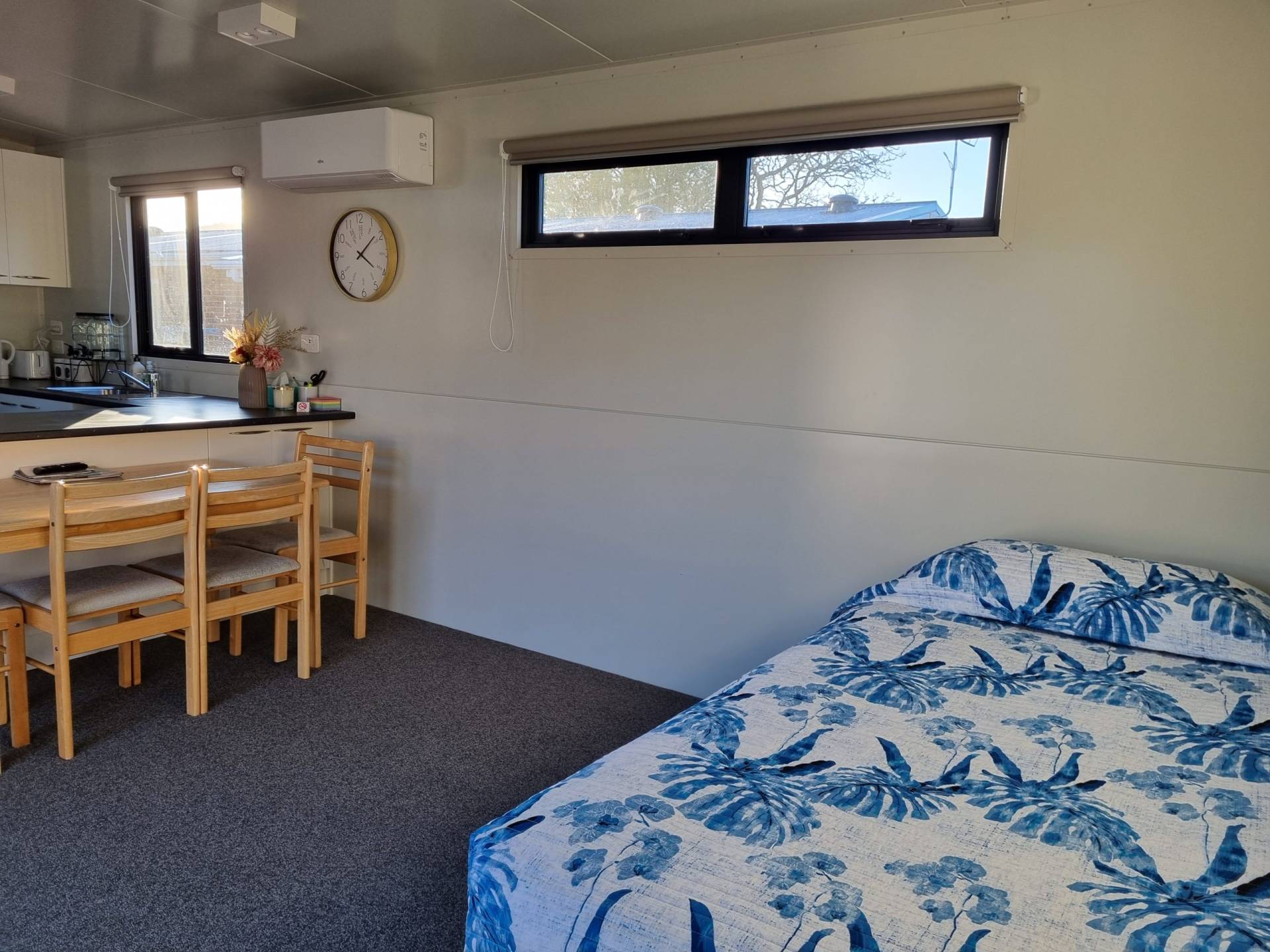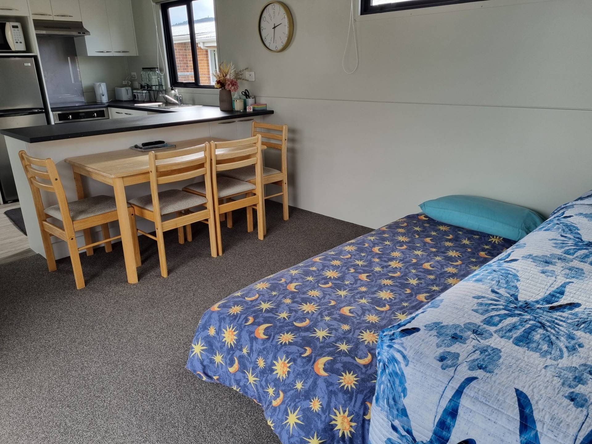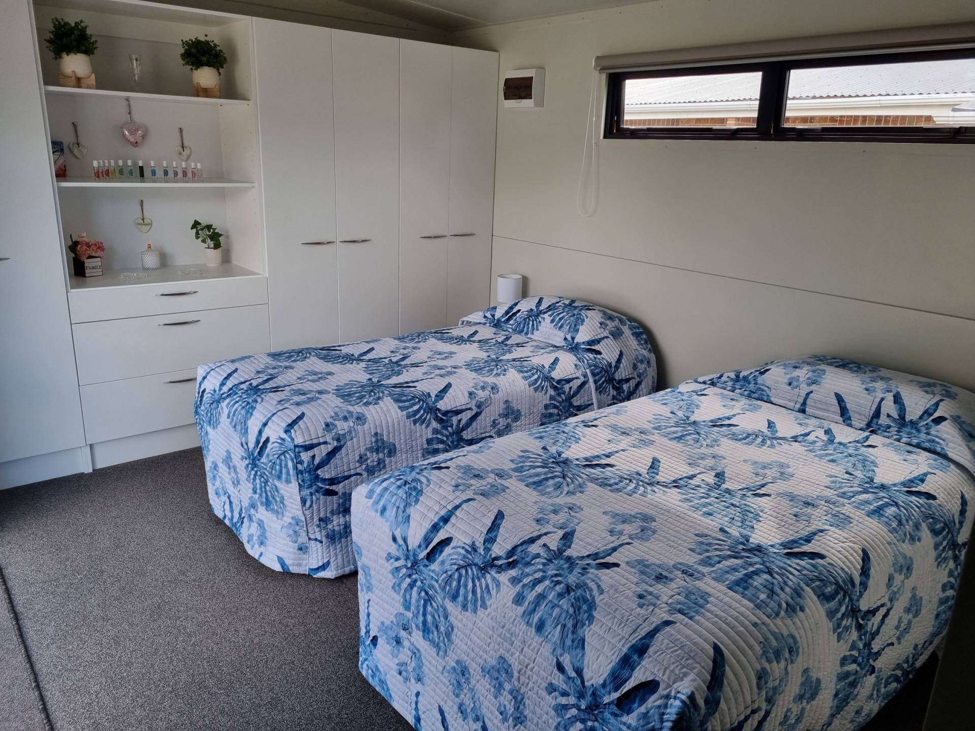 The “Tiny Home” is quite spacious. Sleeps 4 people comfortably. It has 1 bedroom with 2 single beds, massive wardrobe space and awesome access onto the deck. A seperate toilet, shower and handbasin with plenty of cupboard space to place your personal bathroom things. Fully serviced kitchen, with an open dinning room and lounge area with the 2 other beds in the living area (hidden 4th bed as the very versatile trundler bed).